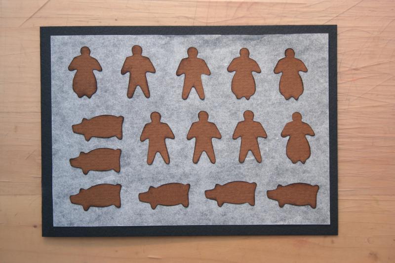 Pepparkakor utskurna med Craft Robo, mall gjord av Peterlina. Använt riktigt bakplåtspapper, vilket var väldigt svårt att limma fast och limma på.